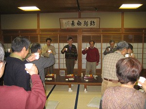 ![]() さあ、楽しくやろう 今年の感謝と望年を・・・ 会長のあいさつに続き乾杯で始まる。 弁当屋から取り寄せた手作り忘年会だ。 |