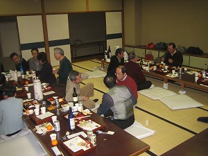![]() 楽しく談笑する会員 会も半ばになるとあちこちで車座となり 一年の思い出や、いうことを聞かない パソコンの調教の仕方など、話し込む。 |