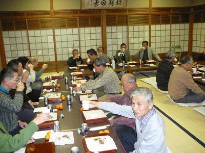 ![]() 集合写真 酔いが回るとだらしない顔となるので、その前に 集合写真をとの意見が出て、皆でカメラに納まる。 |